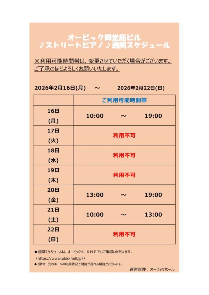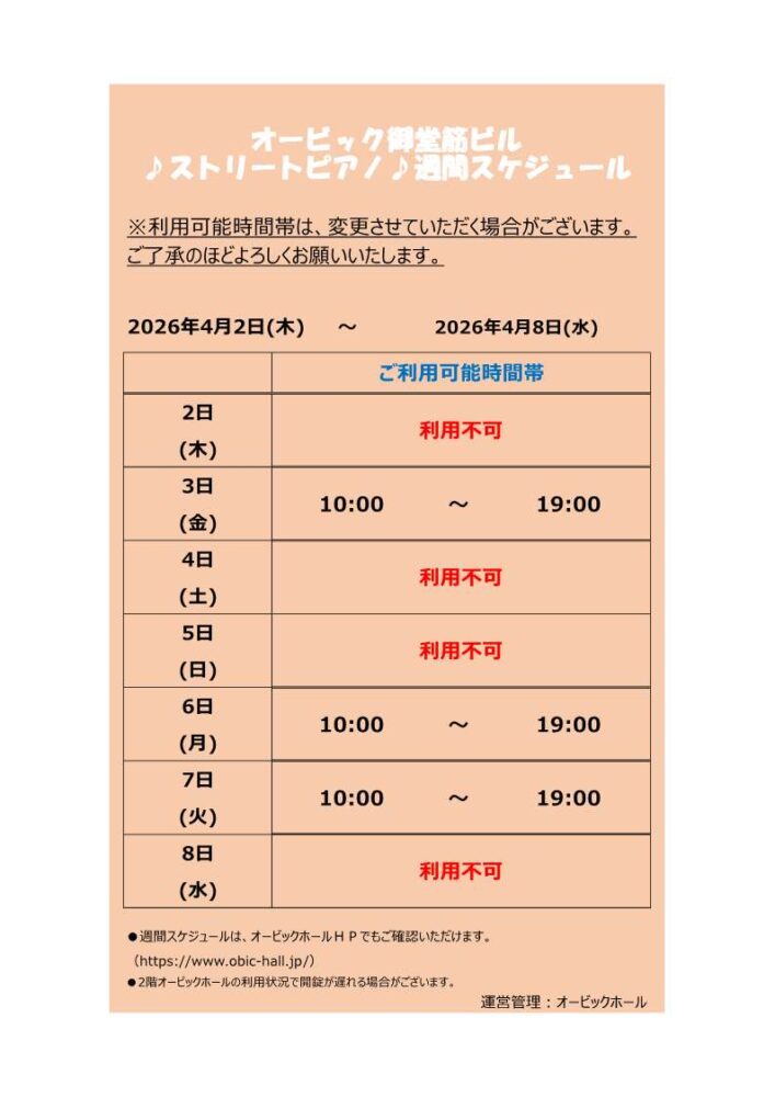 オービック御堂筋ビル1階、ストリートピアノの開放時間のお知らせです。